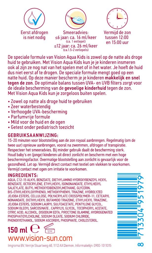 De speciale formule van Vision Aqua Kids is zowel op de natte als droge huid te gebruiken. Met Vision Aqua Kids kun je je kinderen insmeren ook al zijn ze nog nat van het spelen met of in het water. Je hoeft de huid dus niet eerst af te drogen.