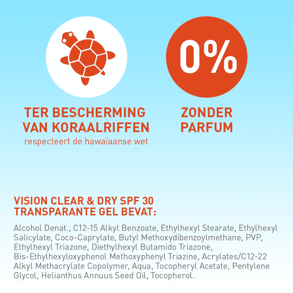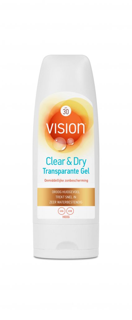 Vision Clear & Dry Protect Gel biedt hoge en onmiddellijke zonbescherming en verkoeling. De 100% transparante gel is onzichtbaar op de huid, laat geen witte strepen achter en geeft een zeer droog huidgevoel. De 100% parfumvrije gel is zweetresistent en zeer waterbestendig.