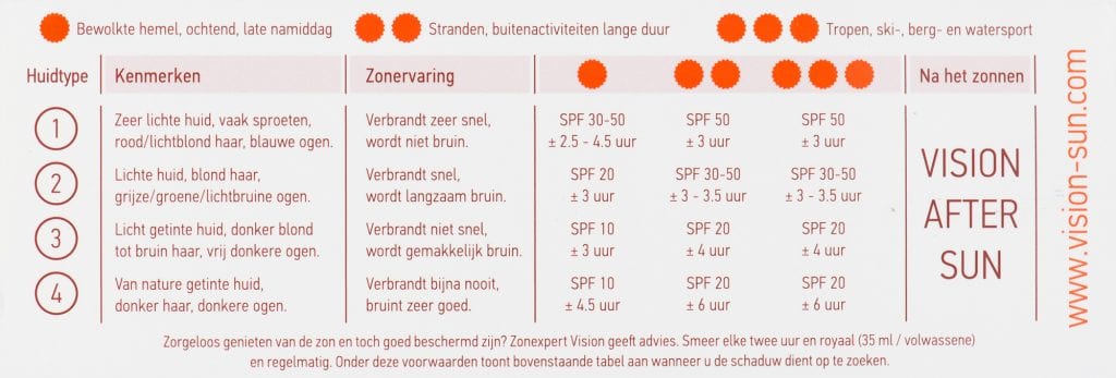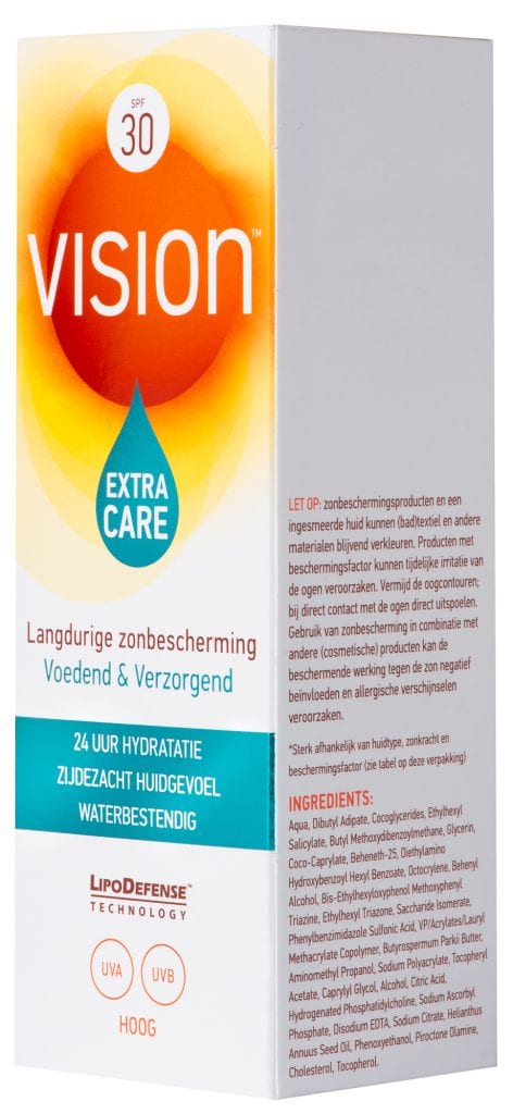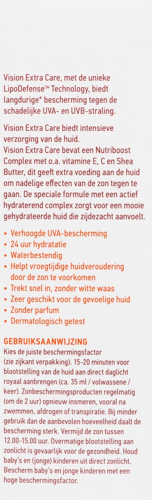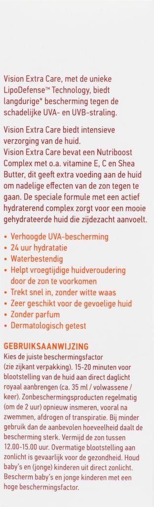 Vision Extra Care bevat een Nutriboost Complex met o.a. vitamine E, C en Shea Butter, dit geeft extra voeding aan de huid om nadelige gevolgen van de zon tegen te gaan.
