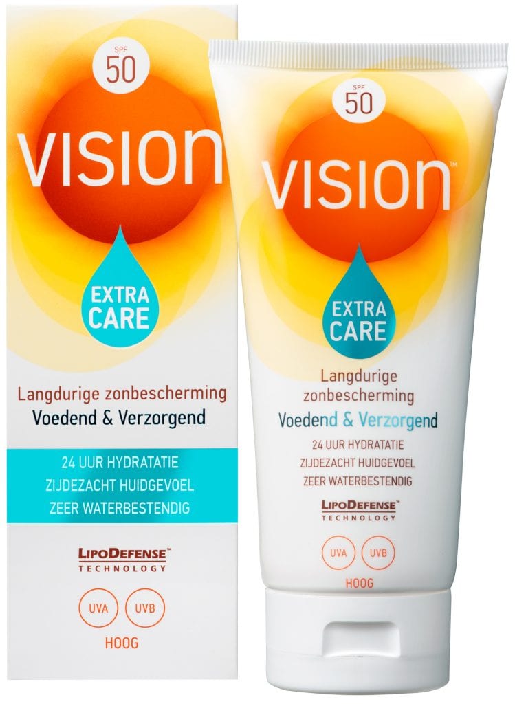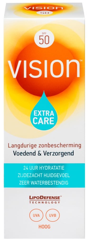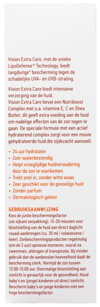 Vision Extra Care SPF 50 biedt naast langdurige zonbescherming voor intensieve verzorging van de huid. Vision Extra Care bevat een Nutriboost Complex met o.a. vitamine E, C en Shea Butter, die extra voeding geeft aan de huid om nadelige effecten van de zon tegen te gaan.